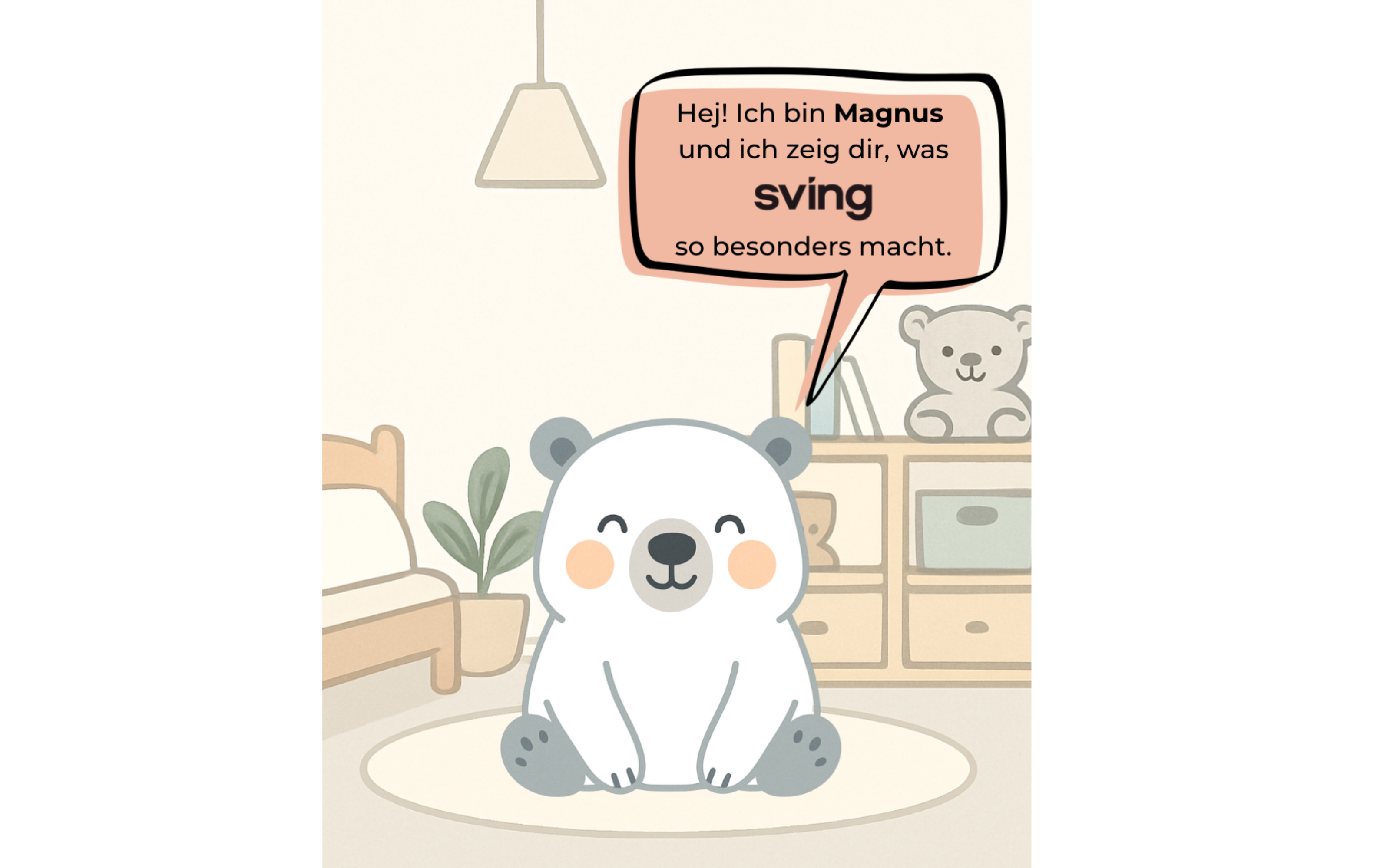 Magnus begleitet Kinder beim Sitzen, Spielen und Lernen. Er macht SVING nahbar und vermittelt Eltern Vertrauen und Sicherheit. Mit Magnus erzählen wir Geschichten, die Familien verbinden.